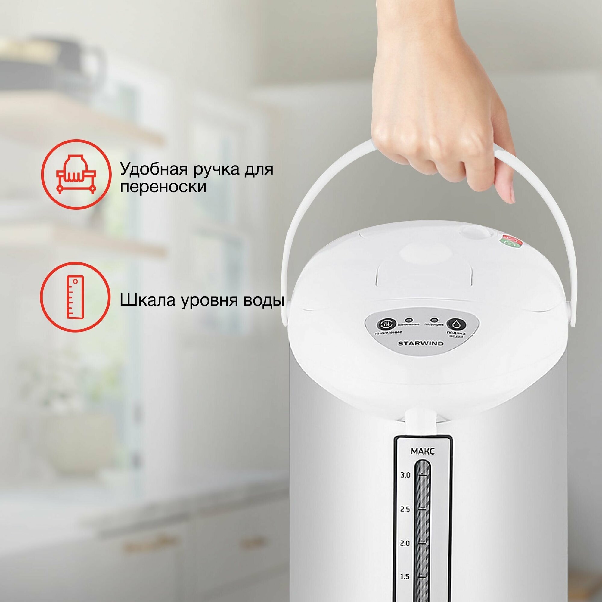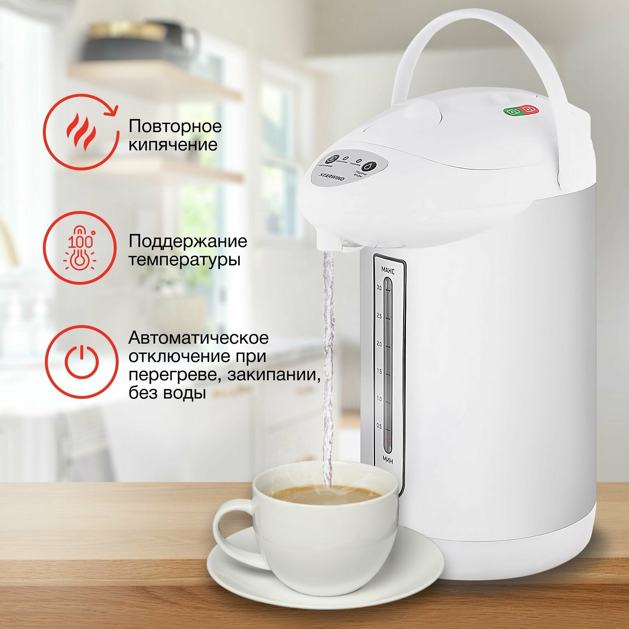 Type: thermo pot, body material: metal/plastic, volume: 3 l, type of heating element: closed, additional functions: long boiling, keeping warm, features: 360-degree rotation, double walls, and