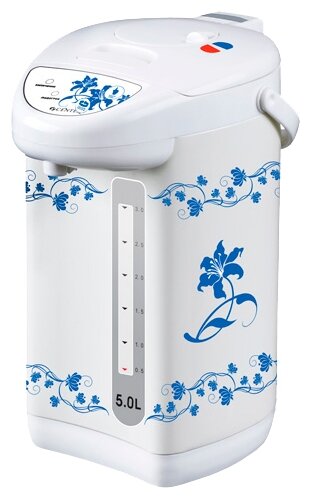 Type: thermopot, body material: plastic, volume: 5 l, type of heating element: closed, features: double walls, water level indicator, drawing on the body, removable cover