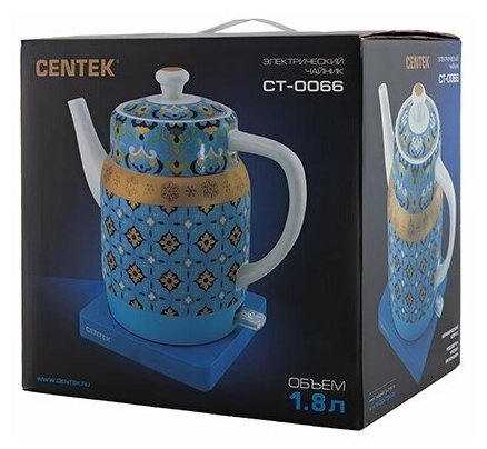 Type: kettle, body material: ceramics, volume: 1.80 l, type of heating element: closed, features: 360 degree rotation, pattern on the body, removable lid, thermal pattern