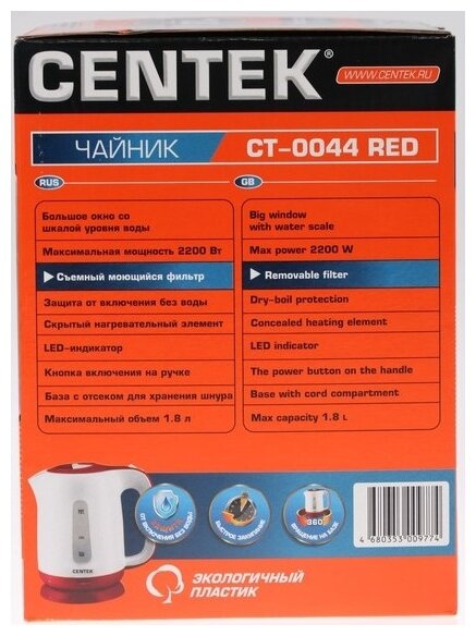 Kettle Centek Ct-0044 Red 1.8L, 2200W, Removable Washable Filter, Water Level Window Piece CENTEK art. CT0044RED