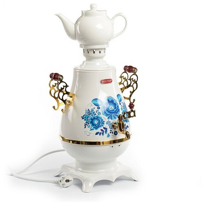 Type: samovar, body material: metal/plastic, volume: 4 l, type of heating element: closed, teapot, additional functions: keeping warm, features: teapot, drawing on the body, removable