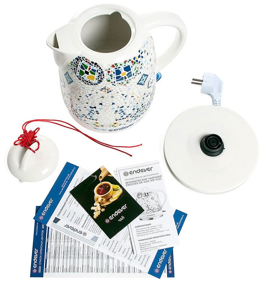 Description: Type: kettle, body material: ceramics, volume: 1.70 l, type of heating element: closed, features: 360 degree rotation, pattern on the body, removable lid