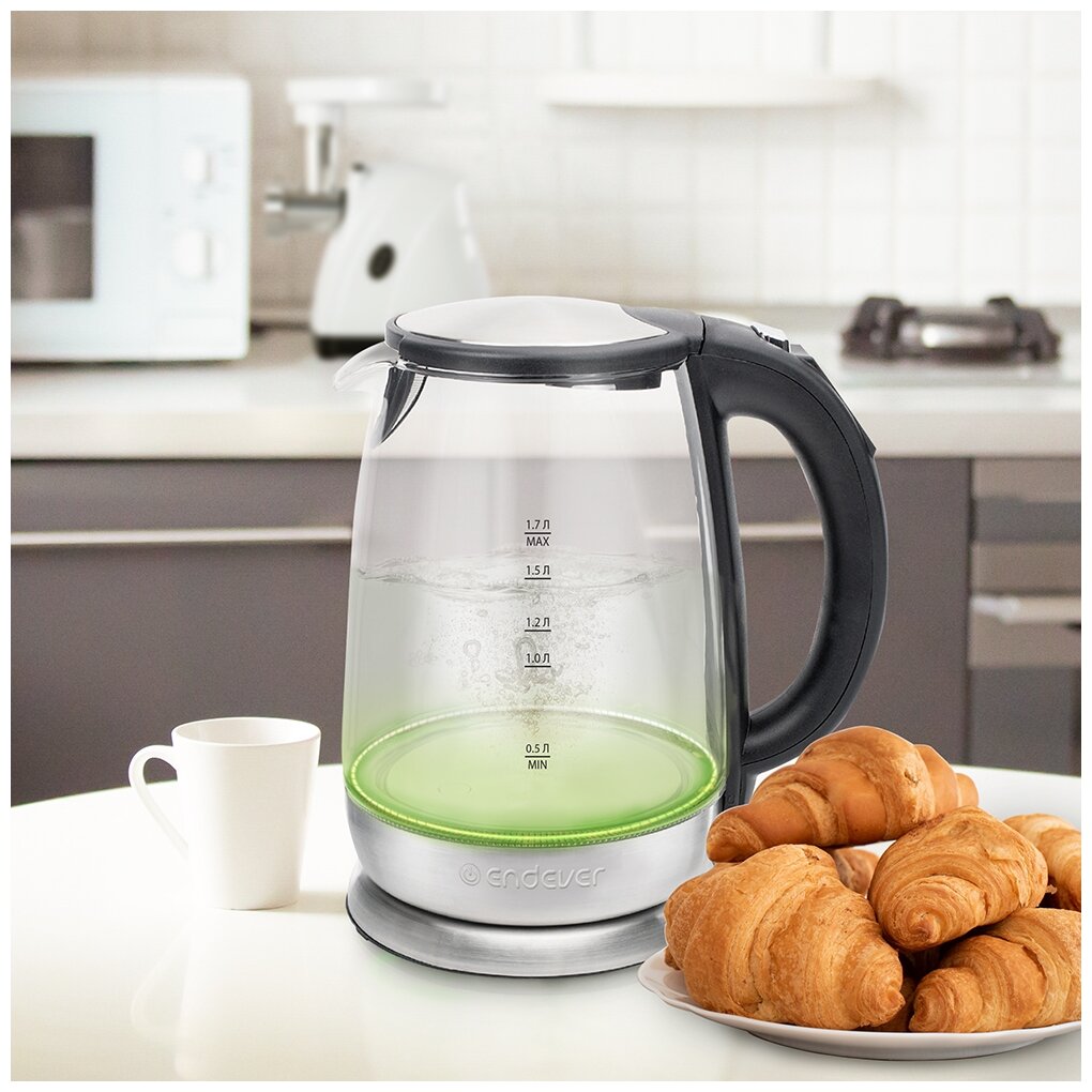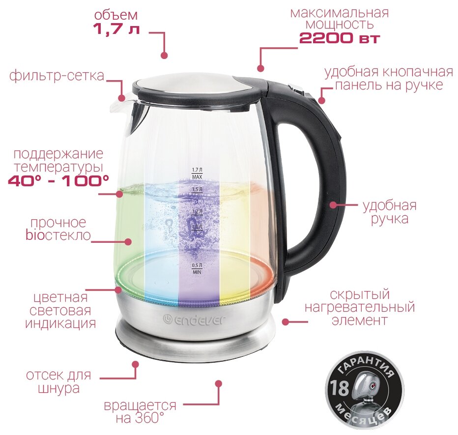 Type: kettle, body material: plastic, volume: 1.70 l, type of heating element: closed, additional functions: keeping warm, features: 360 degree rotation, water level indicator, cord storage compartment