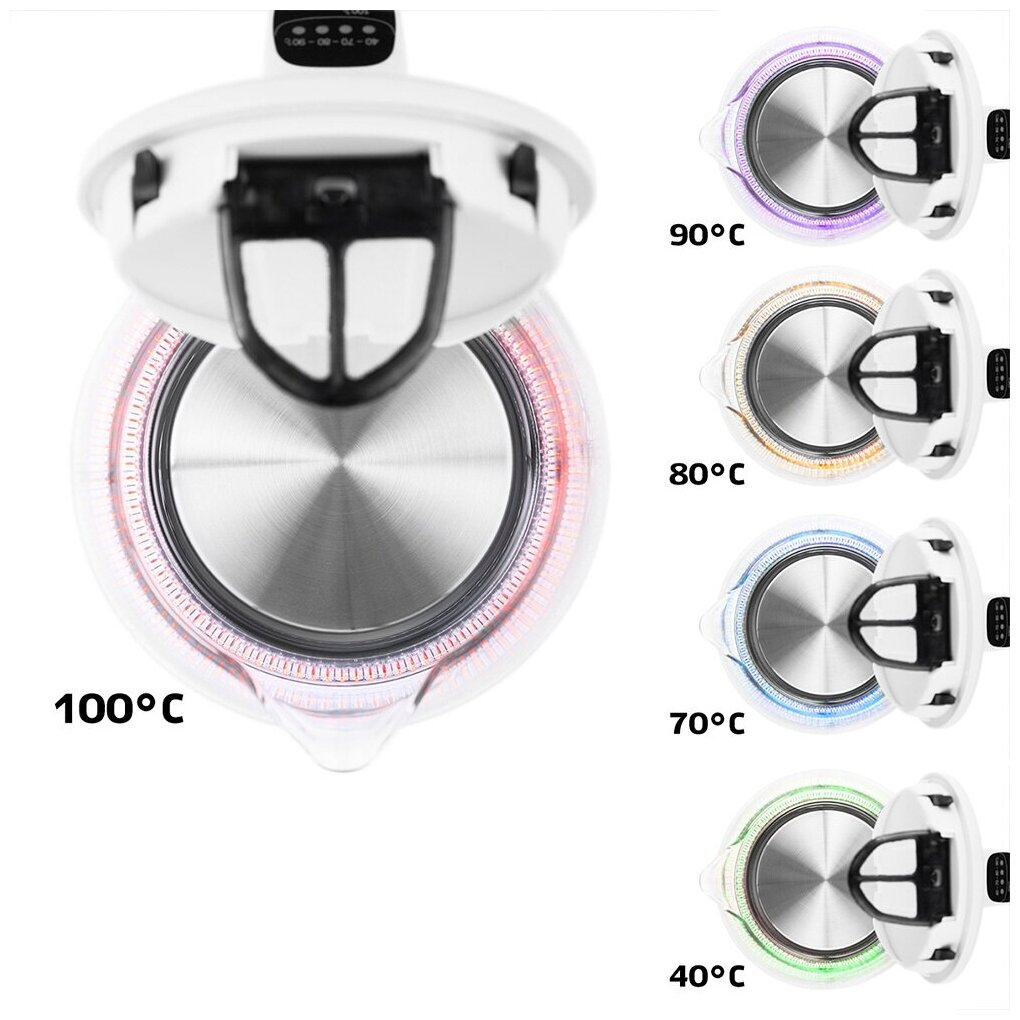 5 water heating modes with a specific backlight color: 40˚C green, 70˚C blue, 80˚C yellow, 90˚C purple, 100˚C red; when the temperature mode is turned on and off, the kettle beeps; equipment: h