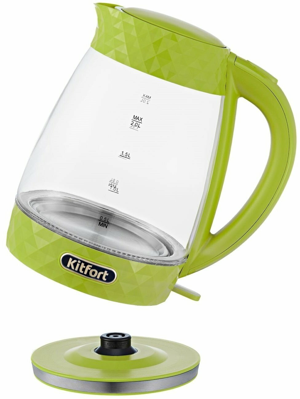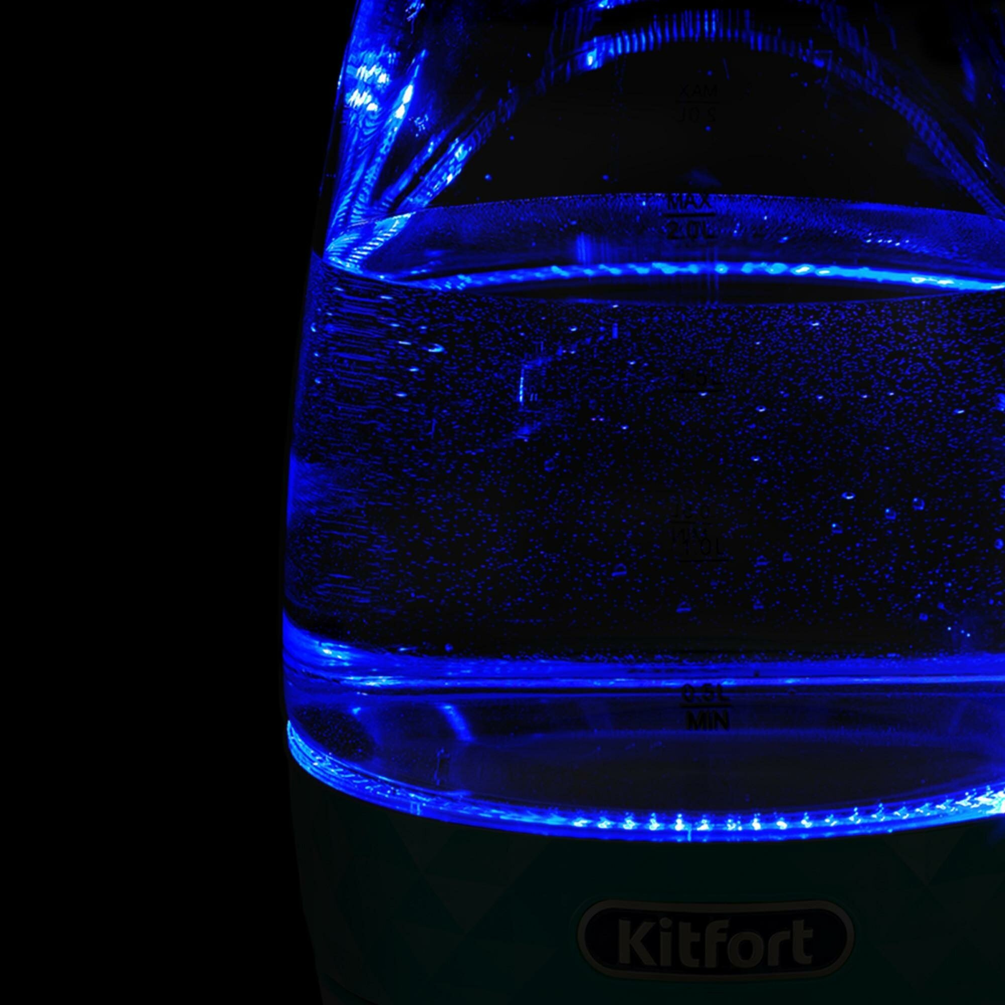 Type: kettle, body material: plastic/glass, volume: 2 l, type of heating element: closed, features: on indication, cord storage compartment