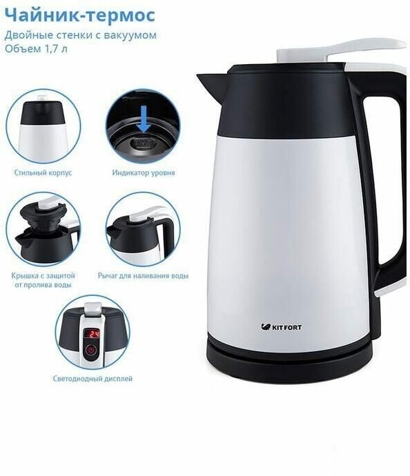 Type: kettle, body material: metal/plastic, volume: 1.70 l, type of heating element: closed, features: 360 degree rotation, double walls, cord storage compartment, removable lid