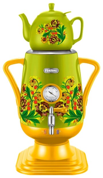 Type: samovar, body material: metal, volume: 4 l, type of heating element: closed, teapot, features: teapot, drawing on the body, removable cover