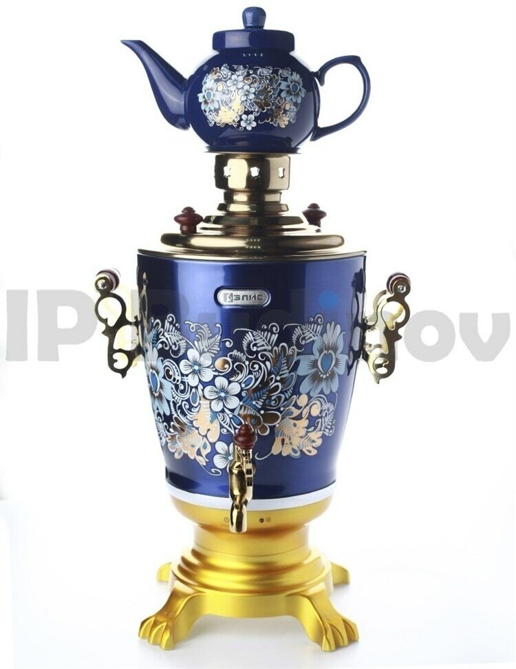 Type: samovar, body material: metal, volume: 4 l, type of heating element: closed, teapot, features: teapot, drawing on the body, removable cover