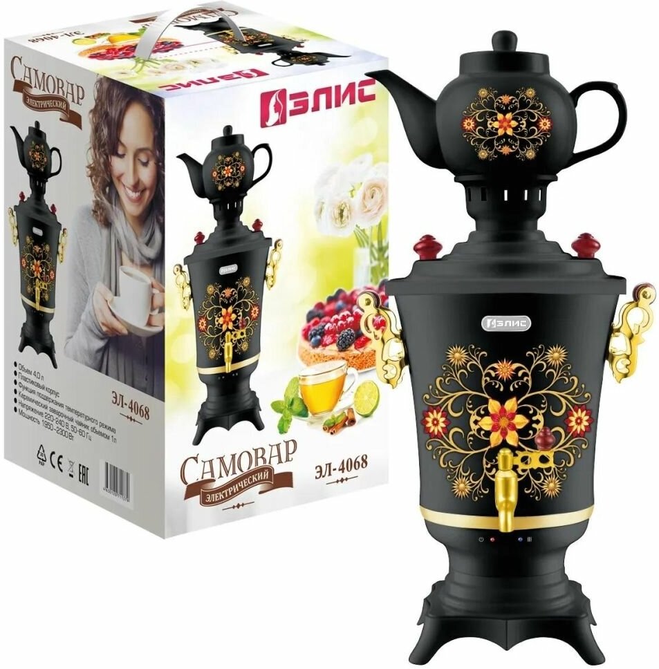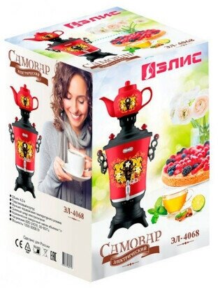 Type: samovar, body material: plastic, volume: 4 l, type of heating element: closed, teapot, additional functions: keeping warm, features: teapot, picture on the body, removable cover