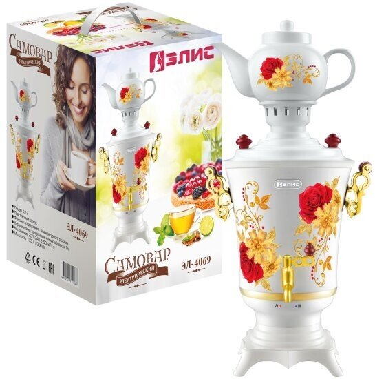 Type: samovar, body material: plastic, volume: 4 l, type of heating element: closed, teapot, additional functions: keeping warm, features: teapot, picture on the body, removable cover