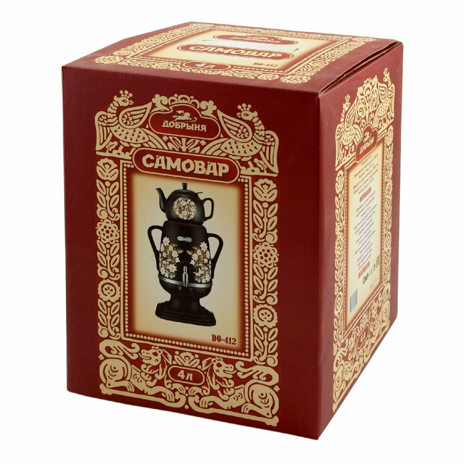 Type: samovar, case material: plastic, volume: 4 l, type of heating element: closed, teapot, features: 360 degree rotation, teapot, drawing on the body, removable cover