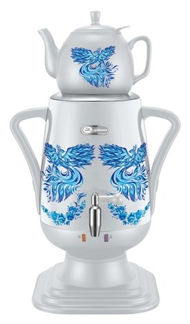 Type: samovar, body material: plastic, volume: 4 l, type of heating element: closed, teapot, features: teapot, drawing on the body, removable lid