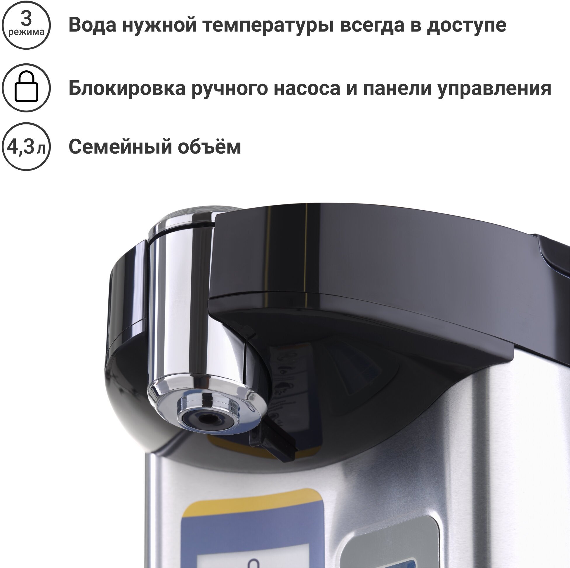 Type: thermopot, case material: metal/plastic, volume: 4.30 l, type of heating element: closed, additional functions: keep warm, features: 360 degree rotation, double walls, water level indicator