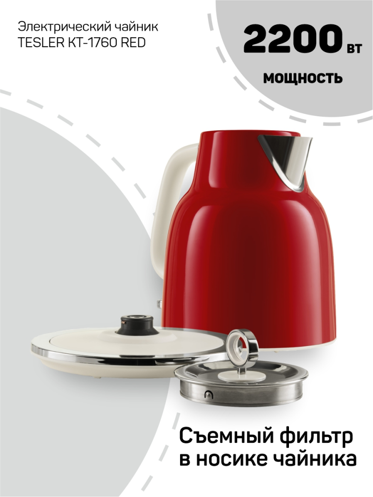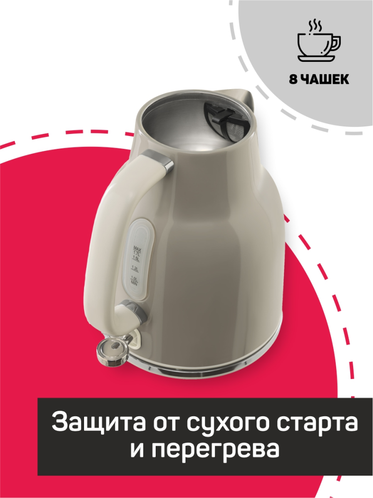Type: kettle, body material: metal, volume: 1.70 l, type of heating element: closed, features: 360 degree rotation, water level indicator, on indication, removable cover