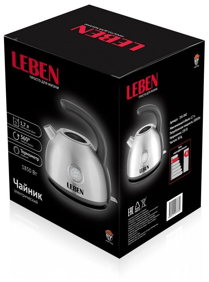 Type: kettle, case material: metal, volume: 1.70 l, type of heating element: closed, features: 360 degree rotation, water level indicator, power on indication