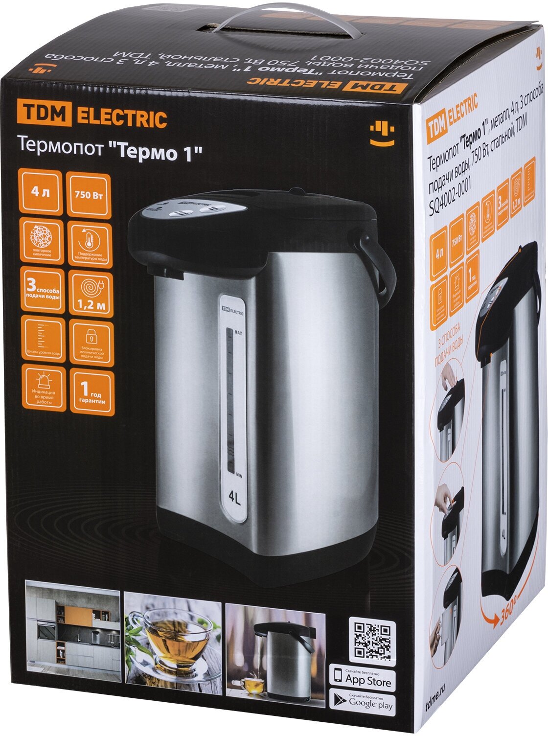 Type: thermopot, case material: metal, volume: 4 l, type of heating element: closed, additional functions: keeping warm, features: double walls, water level indicator