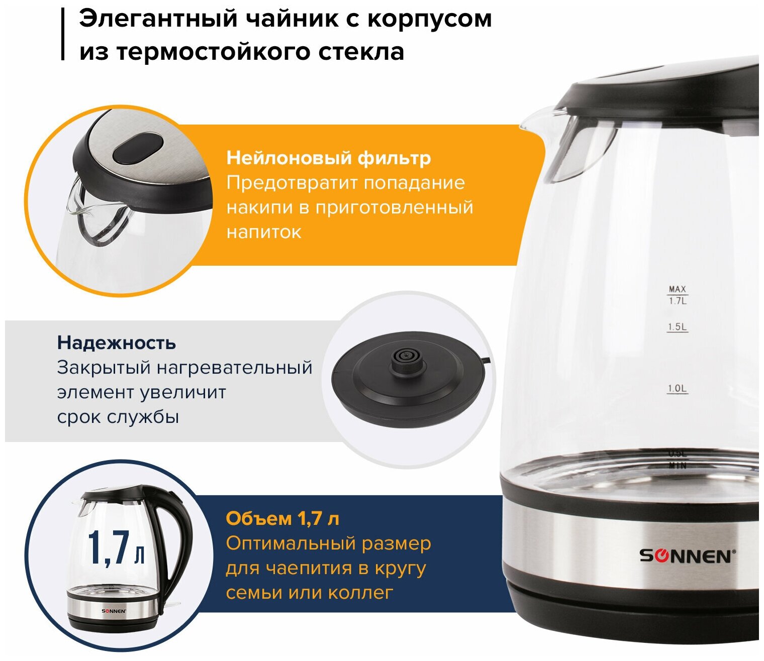 SONNEN KT-201, 1.7 L, 2200 W, indoor heating element, glass, backlight, black, 451712