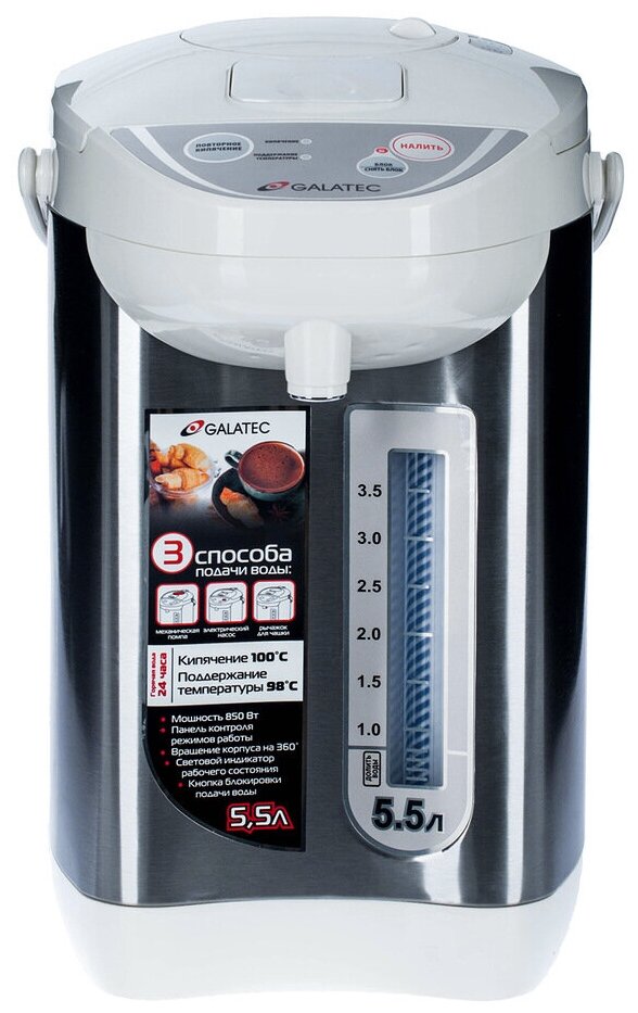 Type: thermopot, body material: metal, volume: 5.50 l, type of heating element: closed, features: 360 degree rotation, double walls, water level indicator