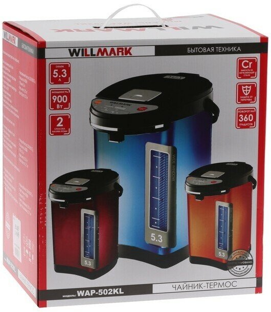 Type: thermopot, case material: metal/plastic, volume: 5.30 l, type of heating element: closed, additional functions: keep warm, features: 360 degree rotation, double walls, water level indicator