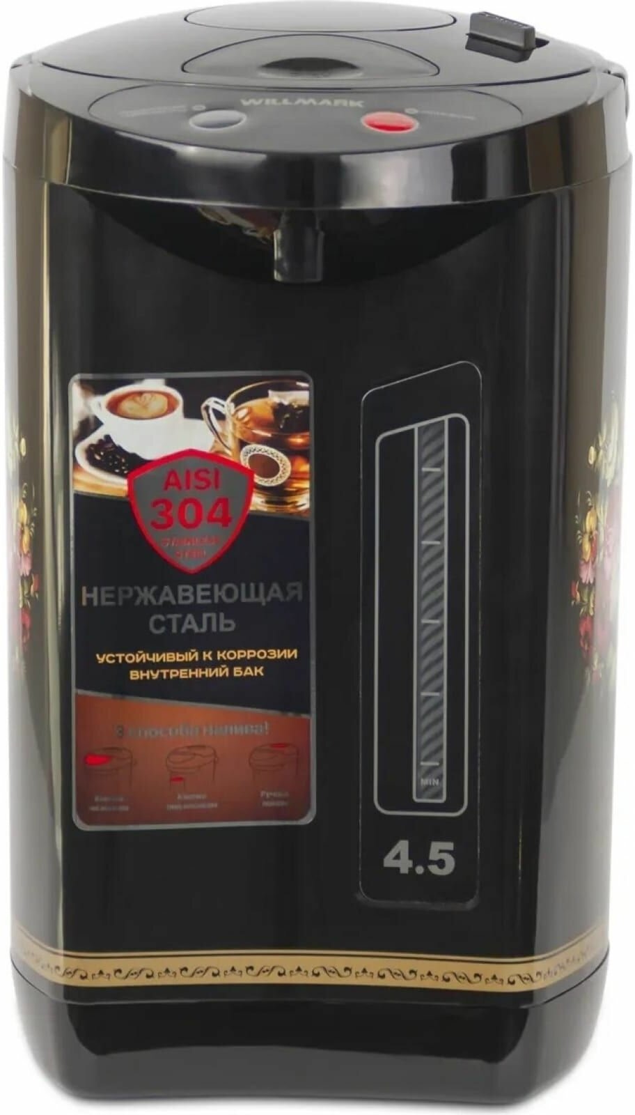 Type: thermopot, case material: metal/plastic, volume: 4.50 l, type of heating element: closed, additional functions: keeping warm, features: maintaining a constant temperature