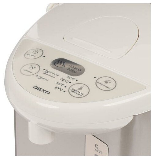 Type: thermopot, body material: metal/plastic, volume: 5 l, additional functions: keeping warm, features: water level indicator, removable cover, on/off, water supply unlock, operating modes,
