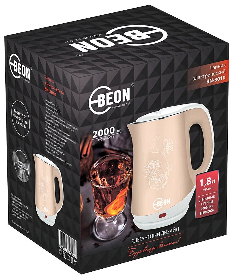 Type: kettle, body material: metal, volume: 1.90 l, type of heating element: closed, features: 360 degree rotation, double walls, drawing on the body, filter