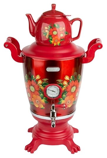 Type: samovar, body material: metal/plastic, volume: 3.50 l, type of heating element: closed, teapot, features: teapot, pattern on the body, removable lid