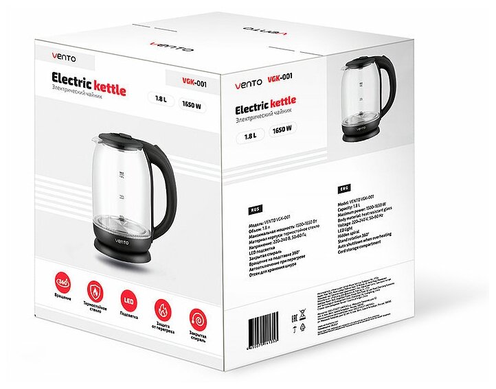 Type: kettle, body material: plastic, volume: 1.80 l, type of heating element: closed, features: 360 degree rotation, water level indicator, power on indication, cord storage compartment