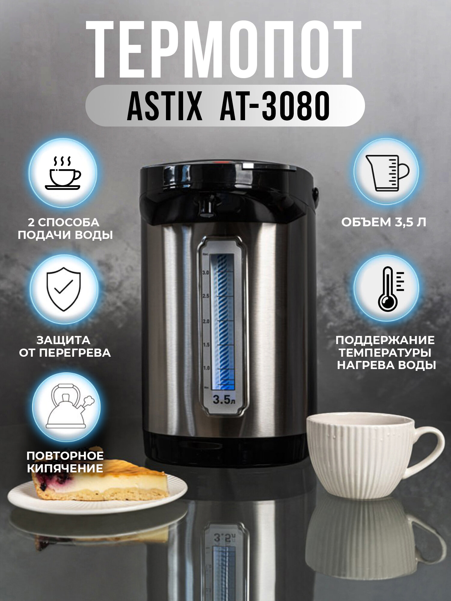 Type: thermopot, body material: plastic, volume: 3.50 l, type of heating element: closed, additional functions: keep warm, features: 360 degree rotation, water level indicator, power on indication