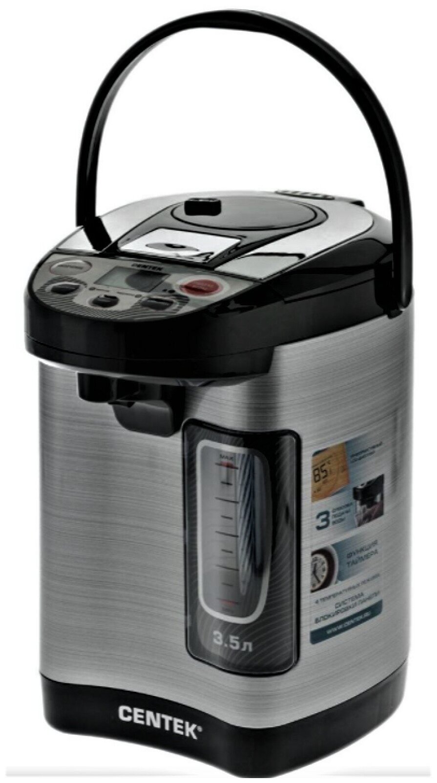 Double walls, display, tea filter, teapot, water level indicator, power on indication, cord storage compartment, touch control