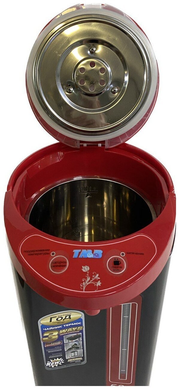 Type: thermopot, case material: metal/plastic, volume: 6 l, type of heating element: closed, additional functions: keeping warm, features: 360 degree rotation, water level indicator