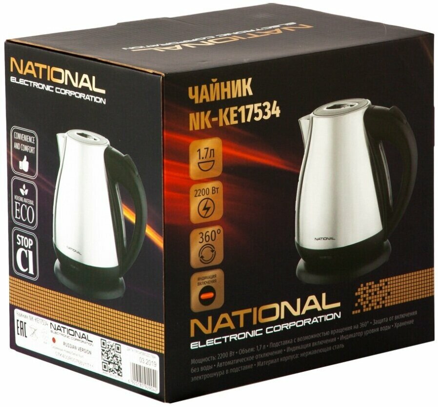 Type: kettle, body material: metal, volume: 1.70 l, type of heating element: closed, features: 360 degree rotation, water level indicator, power on indication, cord storage compartment