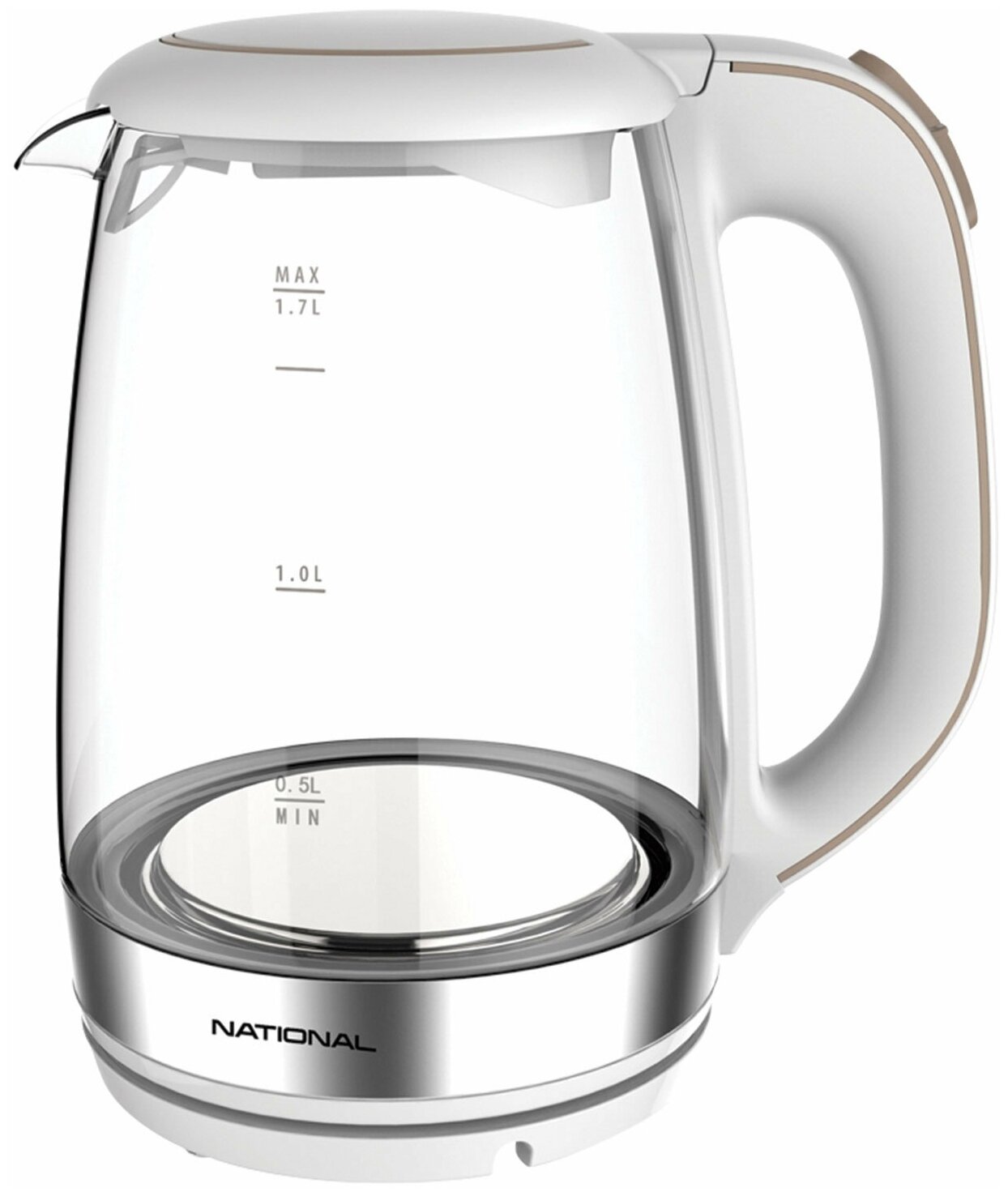 Kettle NATIONAL NK-KE17311, volume 1.7 l, 2200 W, covered heating element, glass, white