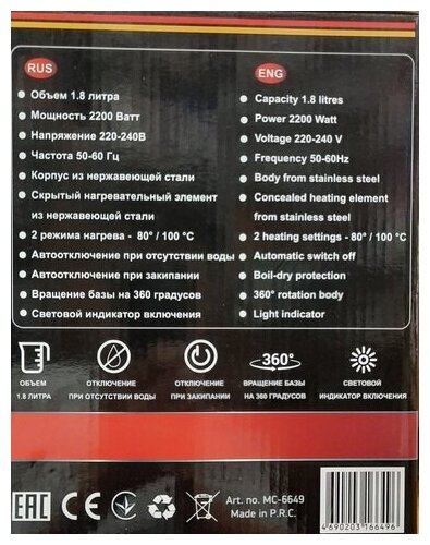Type: kettle, volume: 1.80 l, heating element type: closed