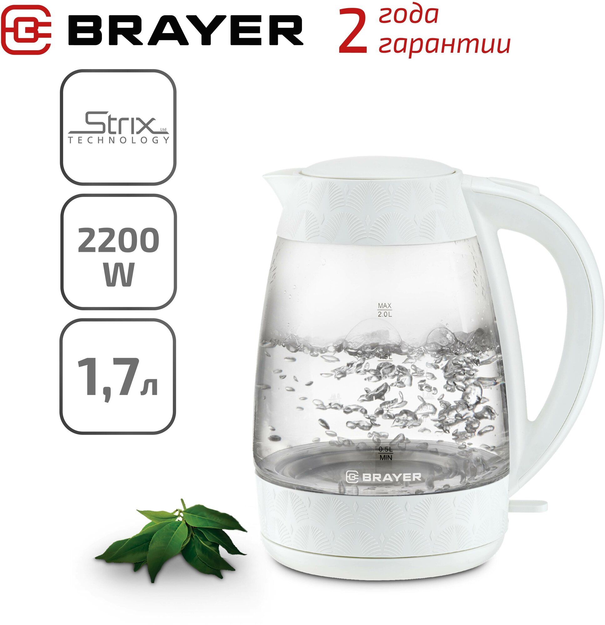 Type: kettle, body material: plastic/glass, volume: 2 l, heating element type: closed, features: 360 degree rotation, water level indicator