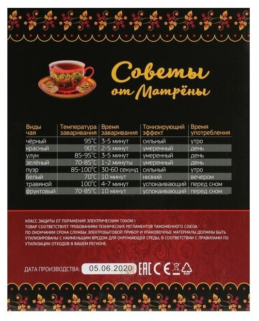 Description: Type: kettle, case material: metal, volume: 1.70 l, type of heating element: closed, features: 360 degree rotation, water level indicator, on indication, cord storage compartment, pattern on the case,