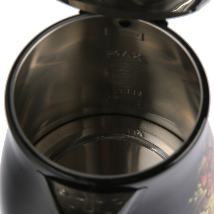 Description: Type: kettle, case material: metal, volume: 1.70 l, type of heating element: closed, features: 360 degree rotation, water level indicator, on indication, cord storage compartment, pattern on the case,