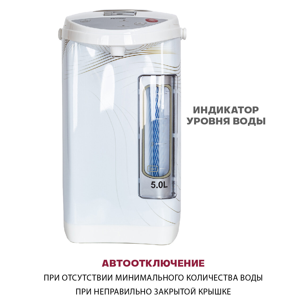 Type: thermopot, case material: plastic, volume: 5 l, additional functions: keeping warm, features: 360 degree rotation, water level indicator, power on indication, drawing on the case