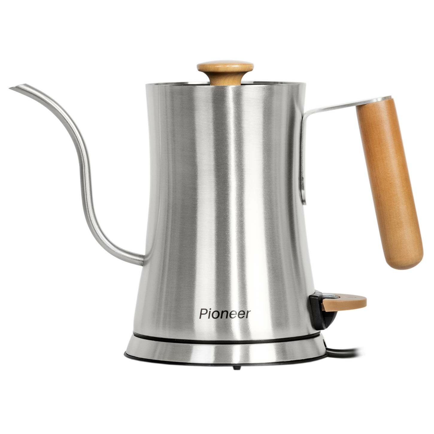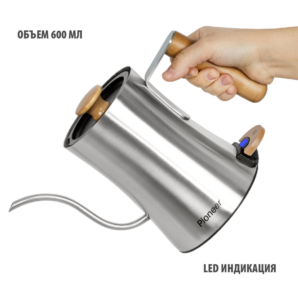 Pioneer stainless steel electric kettle with wooden handle, 0.6 l, LED indication, auto-off when boiling and removing from the base, 1800 W