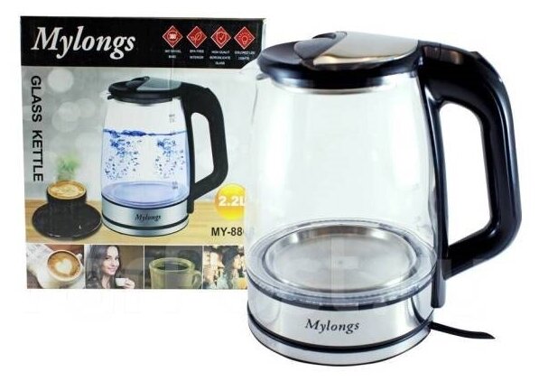 Type: kettle, body material: plastic/glass, volume: 2 l, type of heating element: closed, features: 360 degree rotation, display, brewing filter, water level indicator, power on indication