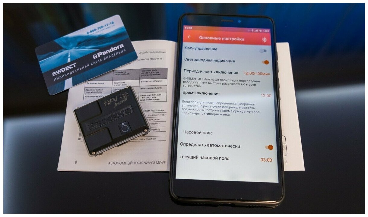 Complete set: - Main block NAV-08 Plus – 1 piece; Keychain BT-760 black – 1 pc.; - NAV-17 GPS antenna clip – 2 pcs. - Screws - 4 pcs.; - SIM card of a mobile operator - 1 pc.; -Pandora/Pandect universal plastic card - 1 pc. - Printed products; - Package.