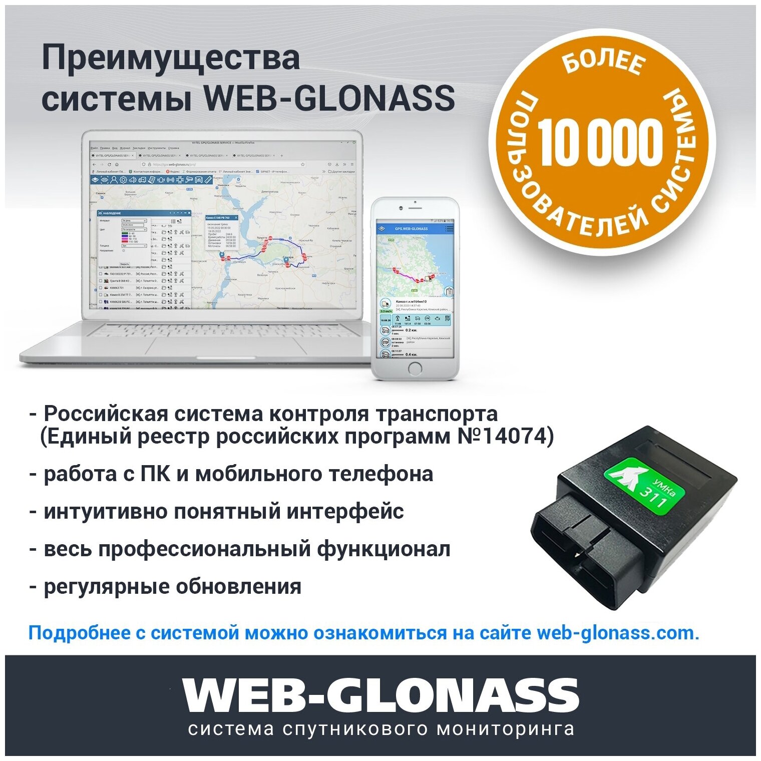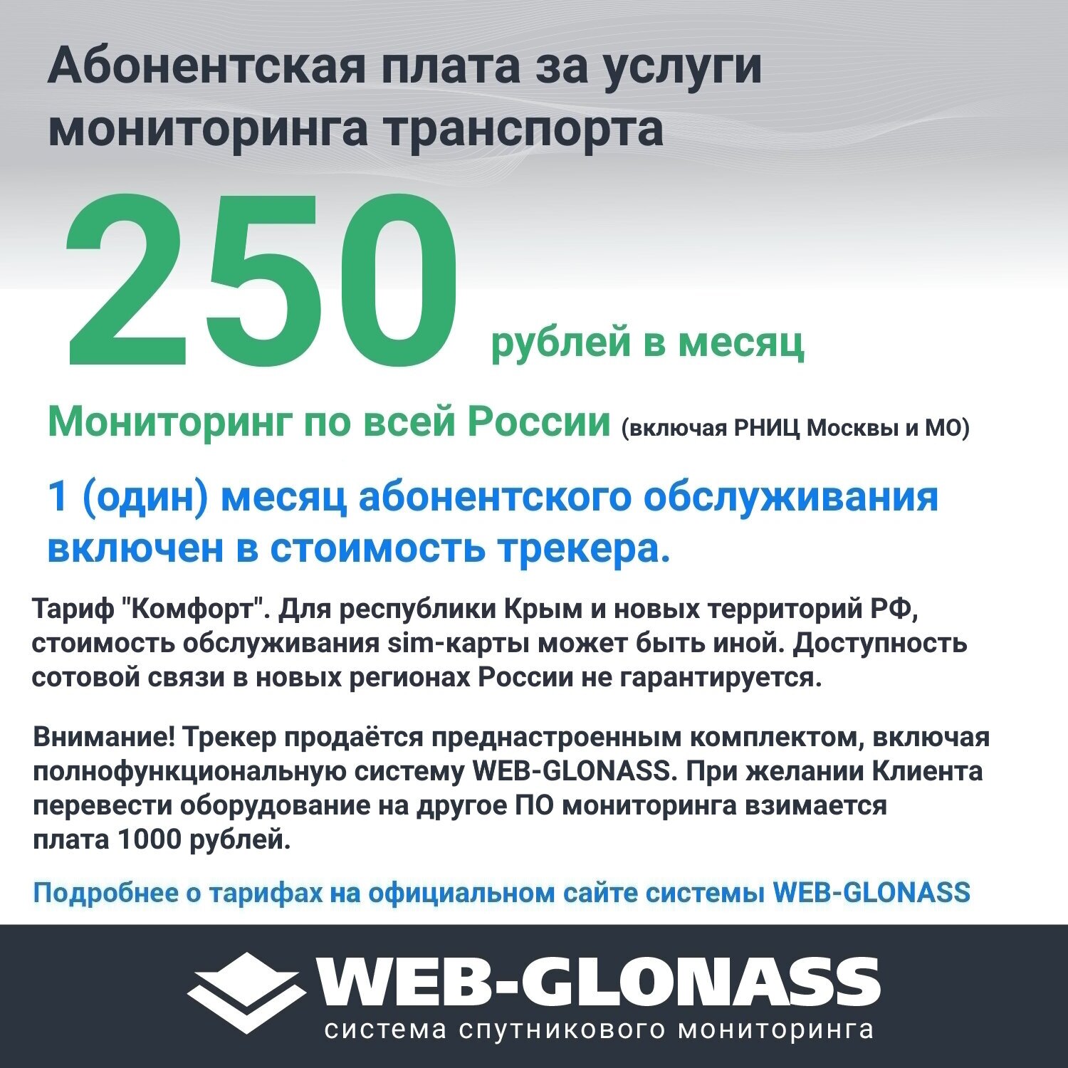 Navigation software: WEB-GLONASS; complete ready-to-use kit; there is a subscription fee for monitoring services