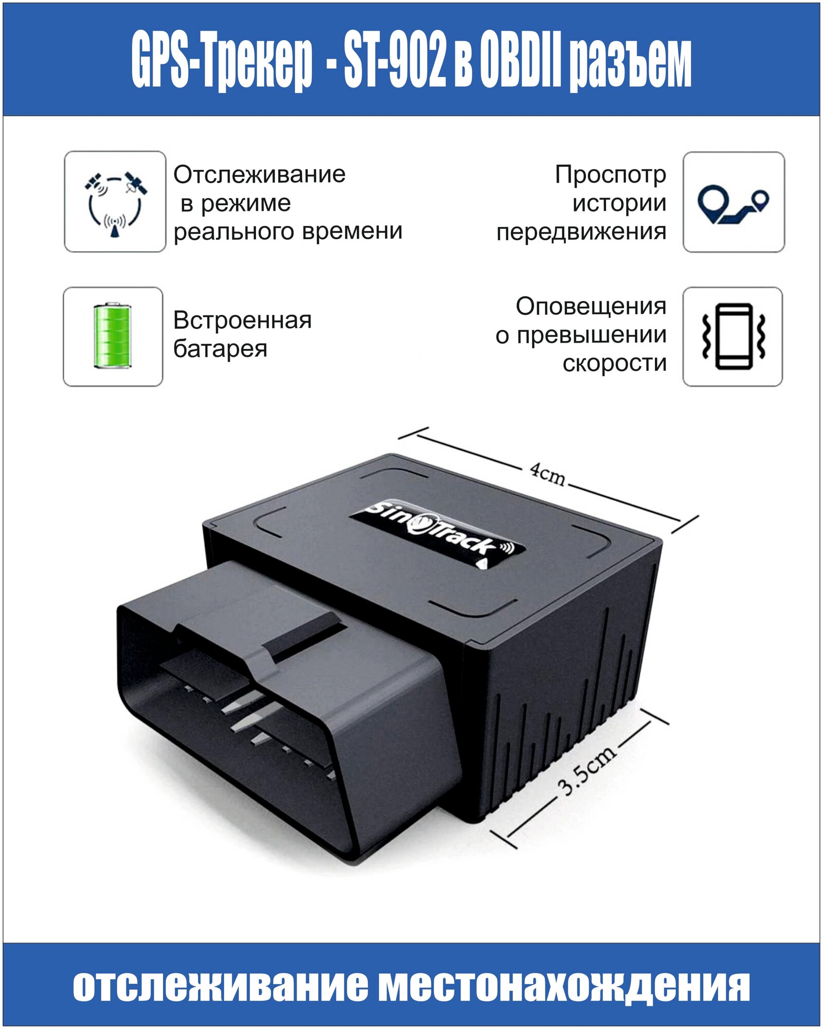 Purpose: automotive, location determination: GPS, GSM, built-in battery/battery, battery life: 3 hours, notification: 3G, SMS, sensors: motion sensor