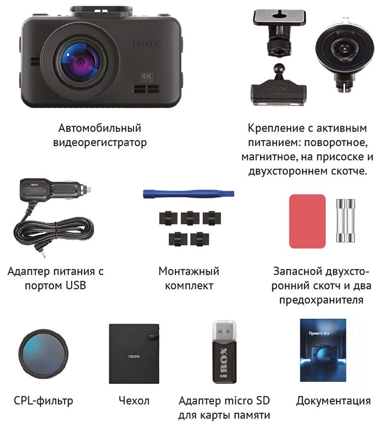DVR, 16GB memory card, Adhesive mount, Suction cup mount, Power adapter, Carrying case, Memory card adapter, CPL filter, Spare 3M tape, Fuses, Documentation