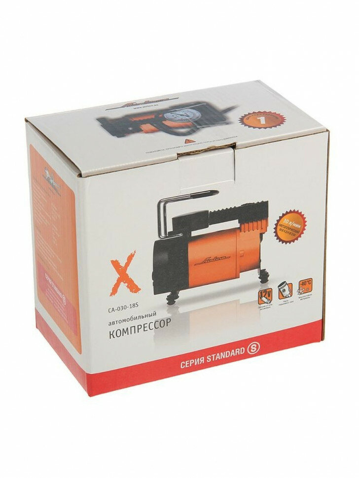 Power supply: from the cigarette lighter socket, voltage: 12 V, inlet capacity: 40 l/min, maximum pressure: 3.50 atm, compressor type: piston, power cable length: 2.80 m, air hose length: 1 m, pressure gauge: analog