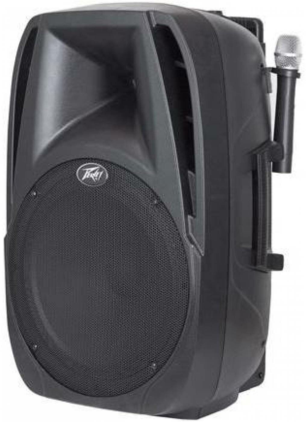 MP3 player with FM receiver and USB port; the ability to connect 2 wireless microphones are not included; built-in rechargeable battery; 2 wheels, 2 handles on the body and 1 retractable for transportation; hole for
