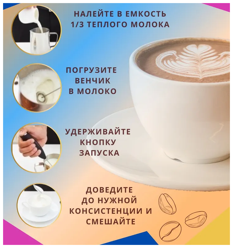 Type: milk frother, type of frother: self-contained, design type: submersible, operating principle: electromechanical