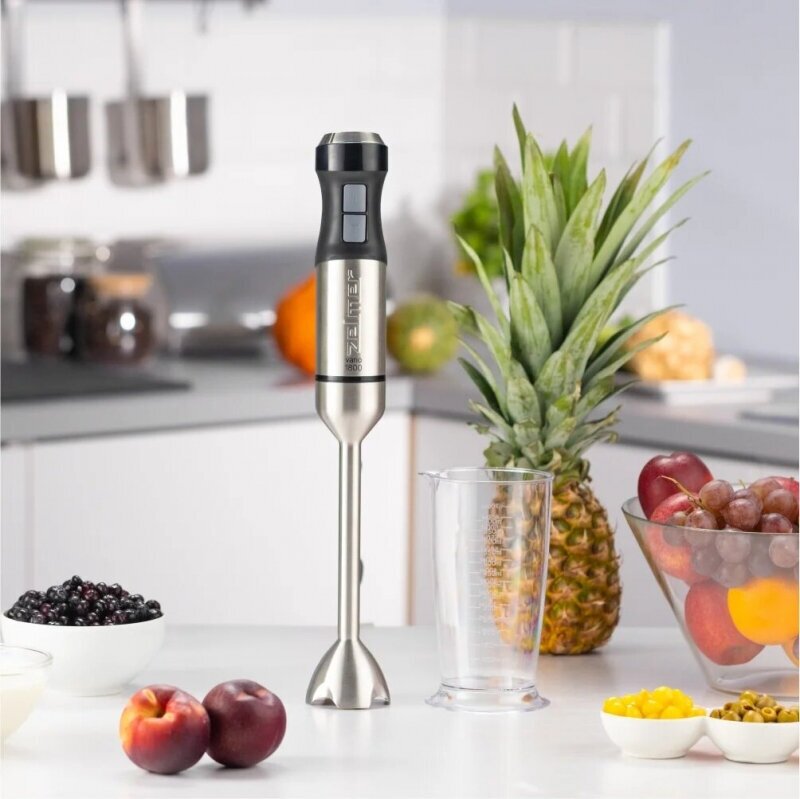 Type: submersible, maximum power: 1000 W, material of the submersible part: metal, attachments: whisk for whipping, for mashing, grinder, included: measuring cup, additional functions: ice pick, smooth speed
