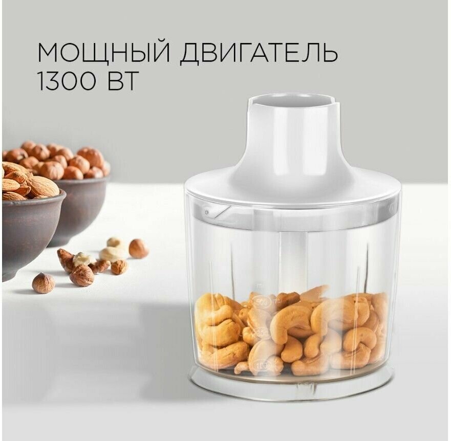 Type: immersion, maximum power: 1300 W, immersion part material: metal, jug material: plastic, attachments: whisk for whipping, for making purees, chopper, blender attachment, included: measuring cup,