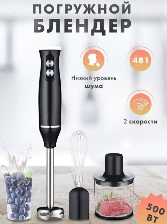 Type: immersion, maximum power: 500 W, immersion part material: metal, jug material: plastic, attachments: whisk, chopper, included: measuring cup, additional functions: ice crusher, container